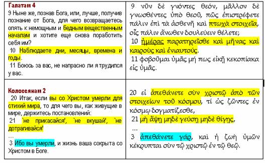 Выше приведенные два выражения Ап. Павла являются взаимосвязанными, параллельными. В обоих речь идет об одном — о „бедных и немощных стихиях/элементах мира”. Если так, то тогда можно дополнить их словами из друг друга, — выйдет: „ Итак, если вы со Христом умерли для стихий мира, то для чего вы, как живущие в мире, держитесь постановлений: `не прикасайся', `не вкушай', `не дотрагивайся', наблюдай дни (недели) и месяцы, и поры и годы”! Итак, дорогие адвентисты, чего вы словно живущие в мире наблюдаете дни недели?